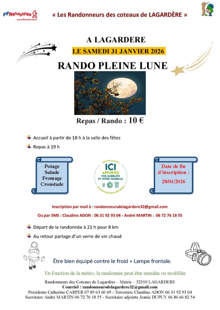 Pour ceux qui ne craignent pas les loups-garous, le club de Lagardere, propose une rando de la pleine lune le samedi 31 janvier 2026, et donc, de nuit et bien équipé. La rando commencera après le repas, vers 21h. Réservation du repas avant le 28 janvier.