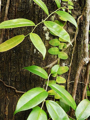 Cette liane s’agrippe aux arbres de la forêt tropicale pour remonter vers la lumière, étalant ses feuilles de façon régulière de part et d’autre d’une tige bien droite.