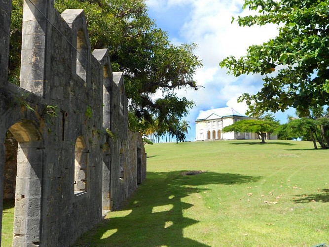 Construite pendant l’occupation anglaise, la maison du maître est en cours de restauration. Restent la tour du moulin à vent, la plateforme circulaire de l’ancien moulin à bêtes, et les ruines de la sucrerie.